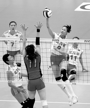 | 12日,在日本横滨举行的世界女排大奖赛总决赛第四轮比赛中,中国队3:1战胜日本队。图为中国队球员赵蕊蕊(右二)在比赛中扣球。新华社发 |