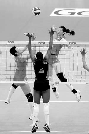 | 7月13日,在日本横滨举行的2008年世界女排大奖赛总决赛中,中国队以2:3负于美国队。图为中国队球员冯坤(左)和薛明(右)进行配合进攻。