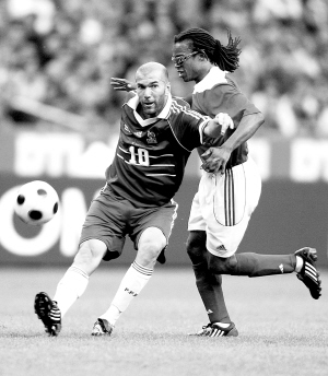7月12日,法国1998世界杯明星队与世界明星队在巴黎郊外的球场进行表演赛,纪念法国在1998年本土举行的世界杯上夺冠10周年。比赛最终结果为3比3。图为法国前著名球星齐达内(左)与荷兰名将戴维斯在比赛中对抗。 新华社发