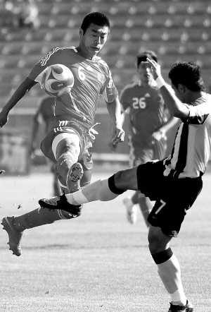 | 7月13日,国奥队在吉林省延吉市进行的奥运热身赛中,以4比0大胜马来西亚国奥队。图为韩鹏(左)与对手拼抢。 新华社发 |
