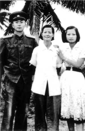 | 1950年代,刘文韶(左)与娘子军连连长冯增敏(中)及其女儿庞学雅合影。 |