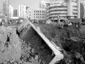 本报热线66810222消息 (记者林伟 实习生陈黛)7月14日下午,海口市国贸玉沙路某工地发生小面积塌方,一辆正在装运泥渣的卡车(见上图,林伟摄)和一辆挖掘机陷落数米深的大坑,幸无人员伤亡。 (报料人:吴先生)