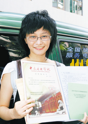 | 7月14日,来自中央音乐学院的我省第一份高考录取通知书,送达考生王巧同学。 本报记者 张杰 摄 |
