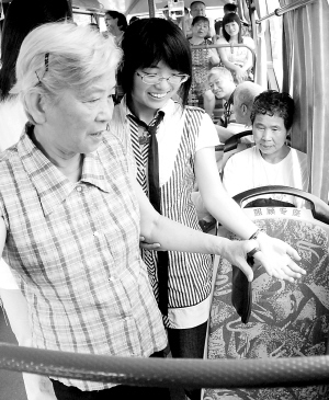 7月14日,浙江省杭州市举行“公交让座日”活动启动仪式。图为一名年轻乘客在公交车上为一位老人让座。 新华社发