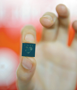 7月14日,一位工作人员在展示产品芯片。当日,重庆重邮信科股份有限公司首批7500部TD-HSDPA高速上网卡开始向中国移动通信集团总公司正式交付使用,这批上网卡将服务于北京奥运会。TD-SCDMA(简称TD)是中国提出的被国际电信联盟接纳和认可的第三代移动通信国际标准。 新华社记者 周衡义 摄