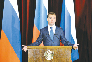 对美在东欧部署反导系统 梅德韦杰夫说 俄将作出回应 7月15日,在俄罗斯首都莫斯科,俄罗斯总统梅德韦杰夫在会见俄罗斯驻外使节代表时发表讲话。梅德韦杰夫当日说,对于美国在东欧部署反导系统,“我们的美国和欧洲伙伴已经被警告”,俄罗斯将不得不采取应对措施。 新华社/路透