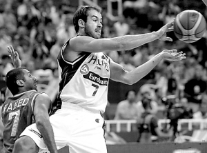 | 东道主希腊大胜黎巴嫩队。图为姚明前火箭队队友斯潘(右)在比赛中。小新发 |