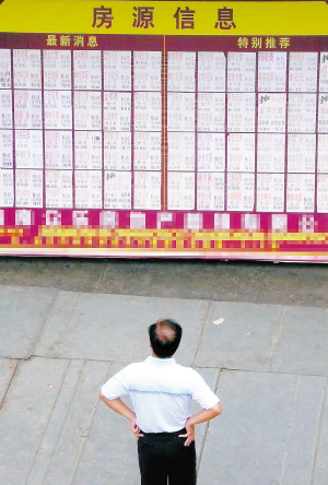 | 7月13日,在海口市海府路一处房产交易信息广告前,一位市民在比较房价。