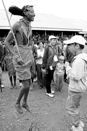 7月16日,在肯尼亚南部卡贾多地区,肯尼亚马赛族艺术家为在2008中国儿童环保绘画比赛中获奖的小朋友表演当地传统舞蹈。 新华社发
