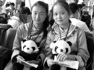7月17日,北川中学的初二学生申婷婷(左)和郑思芸特意带上了熊猫玩具,准备送给俄罗斯的小朋友。 新华社记者 郑悦摄