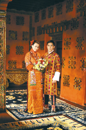 梁朝伟与刘嘉玲21日举行的婚礼已进入倒计时,婚纱照也曝光(上图)。 刘嘉玲在不丹表示,其实去年她和伟仔早已经选定今年7月21日完婚,但婚礼举行地点不丹,却是直到今年4月才决定的。 嘉玲伟仔的婚事在当地已成盛事,不丹王室还特别打破惯例,提供皇宫寝室给新人拍婚纱照,当天,嘉玲与伟仔都穿上不丹的传统国服入镜,同时由不丹皇叔夫妇特别亲自为这对新人着装。伟仔的礼服正是当年皇叔结婚所穿礼服,而嘉玲所穿的礼服则是王妃为年仅两岁的女儿日后出嫁所准备的嫁衣。 (钟新)