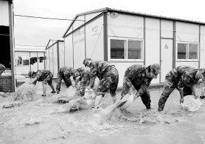 新华社7月21日播发抗震救灾特稿: 和祖国在一起 ———记为抗震救灾而英勇奋战的中国统一战线 →7月21日,驻滇某部炮兵旅官兵在江油市过渡安置房京平小区内清除积水。 7月20日上午至7月21日凌晨,四川省江油市遭受特大暴雨袭击,据气象部门统计江油市的降雨量达到了288毫米。新华社发