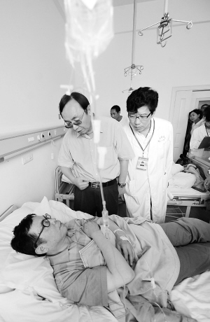 7月21日,昆明公交车爆炸案中的一位受伤者(下)在昆明医学院第一附属医院与医生及探视者交谈。 新华社记者 邹峥 摄