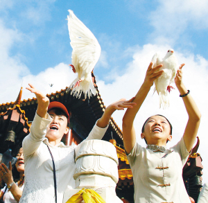 本报三亚7月21日电(记者张谯星 通讯员王克冬)今天上午,三亚市有关部门在南山景区金玉观音阁前举行了一场放飞和平鸽、祈福奥运活动,2008只和平鸽从南海边腾空而起,向北京奥运传递来自天涯海角的祝福。(见左图,均为本报记者程范淦摄)