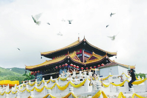 上午,众多游客和市民在南山金玉观音阁参加了一场特殊的祈福法会。在这尊世界上最大的金玉佛像前,游客和市民们一同祝福中国、祈福奥运。随后,2008只和平鸽展翅高翔,带去祖国最南端城市的美好心愿。