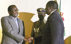 | 7月21日,在津巴布韦首都哈拉雷,津巴布韦总统穆加贝(左)和津巴布韦反对党争取民主变革运动(民革运)领导人茨万吉拉伊(右)在签署一份谅解备忘录后握手。 新华社/路透 |