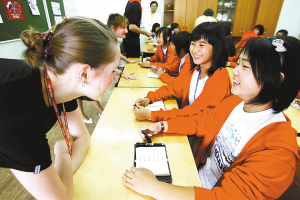 | 7月22日,在俄罗斯符拉迪沃斯托克市的“海洋”全俄儿童中心,俄语陪练(左)正在陪两名中国学生练习口语。在“海洋”全俄儿童中心,前来疗养的中国地震灾区的中小学生们每天下午都有一个小时的时间学习俄语,几天的课程下来,孩子们已经会用简单的俄语交流了。 新华社记者郑悦摄 |