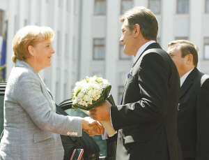7月21日,乌克兰总统尤先科(前右)在首都基辅的总统办公厅前迎接德国总理默克尔(左)到访。默克尔当天表示,支持乌克兰成为欧盟联系成员国和加入北约“成员国行动计划”。 新华社发