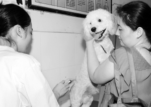 本报海口7月22日讯 (记者李英挺)今天,又有不少市民带着自己的宠物狗,前往省动物疫病预防控制中心动物门诊,为自己的爱犬注射狂犬病疫苗(见上图,李英挺 摄)。有关人士提醒,离最后期限只有9天了,希望广大市民尽快带自己的狗来注射疫苗。