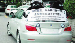 | 宝马车的车尾箱上,马女士放了两个可爱的狗熊公仔抱着“警告牌”,公仔的眼睛上也贴了宝马标志。 |