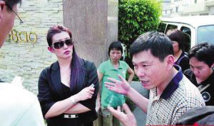 | 经销商负责人范先生(右二)称他们会尽量与马女士(戴墨镜者)协商解决问题 |