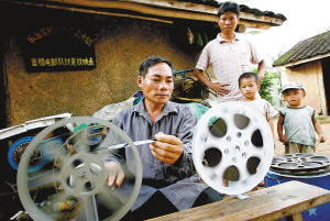 | 在乐东黎族自治县万冲镇国强村,49岁的黎族电影放映员刘文胜在倒卷16毫米电影片,为晚上的一场放映做准备工作。 本报记者 宋国强 摄 |