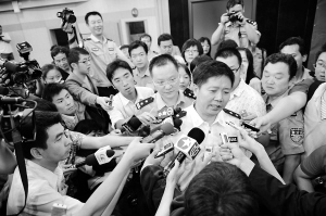 | 7月22日,昆明市公安局长杜敏(中前)接受记者采访。 新华社记者 秦晴 摄 |
