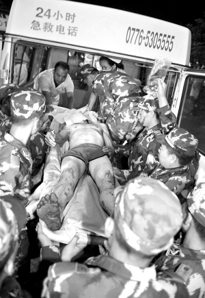 7月22日2时55分,记者赶到田东县人民医院时,一辆救护车恰好匆匆开至医院诊楼前。一位满身煤灰、头发被泥浆水湿透的矿工被医护人员抬下救护车,迅速送往抢救室进行急救。