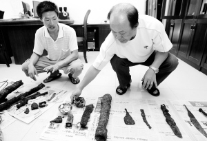 10多件锈蚀严重的铁质物件,被何翔摆放在省博物馆一间办公室的地板上。记者在现场看到,这些物件虽然锈蚀严重,但可以辨别出形状。