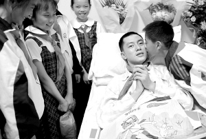| 图为昆明市盘龙区工农小学的学生看望龚志华(7月14日摄)。 新华社发 |