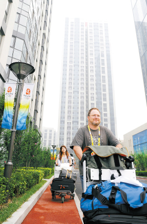 7月25日,北京奥运会媒体村开村,开始迎接参加奥运会报道的媒体工作人员。图为两名抵达北京奥运会媒体村的媒体工作人员前往住处。新华社发
