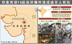 艾哈迈达巴德市是古吉拉特邦主要商业城市。26日晚,艾哈迈达巴德市的市场、汽车站、居民区和医院等人群密集区域发生18起连环爆炸。