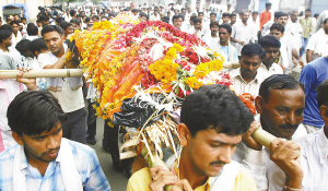 | 七月二十七日,印度民众为一名连环爆炸事件遇难者举行葬礼。 新华社/法新 |