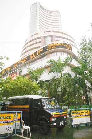 | 7月27日, 一辆警车驶出已被警方封锁的孟买证券交易所大楼。由于连环爆炸,使得印度各主要城市进入高度戒备状态,以防遭到恐怖袭击。 新华社/路透 |
