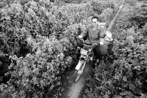 | 7月19日,刘文胜骑着一辆满载着电影放映设备的摩托车行进在乡村小道上,准备为附近村民放电影。
