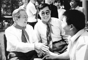 | 1994年6月1日,郑立军(右一)在北京宋庆龄基金会联谊活动中,见到了原国务院副总理兼外长黄华同志(左一)。 |