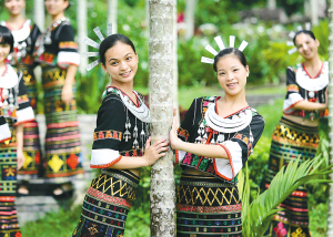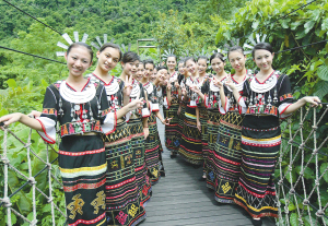 在热带雨林中,身穿富有海南特色的黎族苗族服装的选手们,在摄影师的镜头前,与身后青葱翠绿的热带植物一起,展示着她们各自不同的美丽。