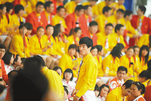 9时许,中国代表团成员开始列队准备进场参加开村和升旗仪式时,一个高大身影在一片红黄色海洋中格外突兀———姚明出现了,记者一阵骚动,立即包围上去,长枪短炮录音机等各式武器迅速对准姚明。