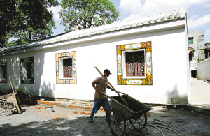 7月25日,在海口市解放西路竹林里131号,工人们正在忙着对中共琼崖一大会址进行修缮,修缮工作预计8月底完工。 据了解,国家文物局拨款245万元,加上海口市配套资金共400万元修缮该会址。 本报记者 张杰 实习生 吴光曙 摄