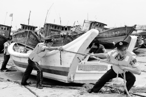 7月27日,福建莆田边防官兵协力牵引船只回港避风。当日,福建省气象台紧急发布台风黄色预警信号。福建省莆田市公安边防支队迅速启动应急预案,不间断向渔民通报台风“凤凰”的情况,并组织在海上作业的渔船全部进港避风。 新华社发(孙卫锋 摄)