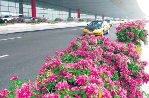 | 日前,首都机场高速路及T2、T3航站楼的花卉布置工程全面完成。图为7月28日,一辆出租车驶过万花夹道的T3航站楼。 |