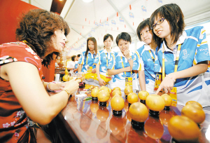 | 7月28日,在北京奥运村内为各国运动员提供语言服务的志愿者们来到中国民族民间手工艺展示现场参观、学习。 |