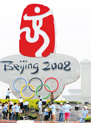 | 7月28日,工人们在天安门广场用鲜花装点“中国印”花坛,将有100万盆精心培育的花卉在此摆放。 |