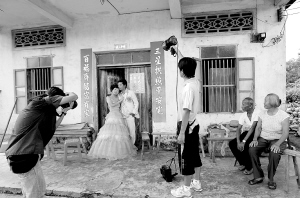 7月27日,一对新人在文昌市龙楼镇红海村村民林鸿冠、黄桂芳老夫妇(右二右一)的屋前拍摄婚纱照片。 随着文昌航天发射中心移民安置区的土地平整工作进入尾声,占地一千多亩移民安置区即将动工,这所老夫妇居住的老屋也将拆迁。选择与龙楼老屋留影,心中或许怀着诸多的不舍,但相信他们更憧憬龙楼美丽的未来。 本报记者 宋国强 摄