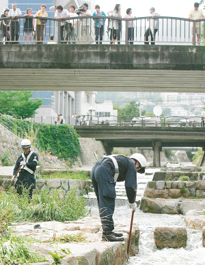 7月28日,警察在日本神户市检查河道。日本近畿地区当日普降大雨,引发洪水,目前已造成4人死亡。 新华社/法新