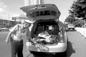 上午9时30分,一辆未挂号牌的新普力马在万绿园路段被执勤的民警拦下,车一停,司机主动将驾驶证、行驶证掏出来递给交警。行驶证上该车牌号为:琼AC9486。但车的前后都没有看到车牌。经提示,车主才不情愿地打开后备箱将车牌交到交警手中(见右图,陶晓明摄)。