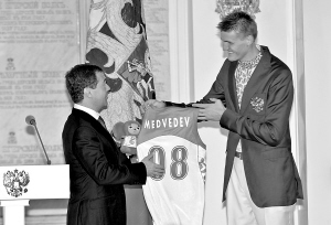 7月29日, 俄罗斯在首都莫斯科克里姆林宫举行北京奥运会俄罗斯代表团送行仪式。图为著名篮球运动员基里连科(右)向俄总统梅德韦杰夫赠送印有梅德韦杰夫名字的运动衫。 新华社发