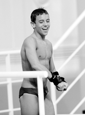7月29日上午,国家游泳中心“水立方”的跳水比赛池迎来了首个来此试水的队伍———英国跳水队,有“神童”之称的14岁小将托马斯·戴利显得兴致高涨,分外引人注目。 新华社发