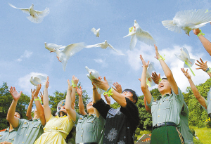 7月29日上午,在海口火山口国家地质公园,武警海南总队医院的医护人员和一些市民在放飞白鸽。为了庆祝建军81周年,武警海南总队医院、海南省妇联携手创办的“绿丝带舞动椰城,1元存健康”爱心公益活动当天正式启动。 本报记者 林萌 实习生 吴光曙 摄