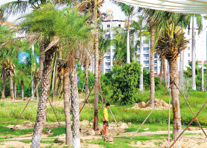 鹿回头广场新近栽种的椰子树很快引起了市民的关注,纷纷打听鹿回头广场是否要变脸。今天上午,记者在鹿回头广场看到,数台工程车正在施工,在吊车的帮助下,园林工人正在栽种椰子树。工人们告诉记者,他们已连续施工3天了,在广场内种下了数百棵椰子树。